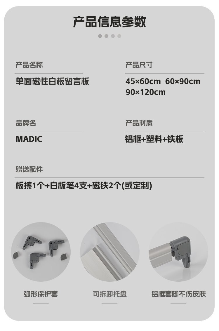 简要描述:这款挂墙磁性白板写字板采用银色铝合金外框,外观简约大方,适合各种场合使用。它具有隐藏式安装孔,安装简便,不影响美观。同时,多种尺寸规格可选,满足不同空间需求。适合家庭、办公、商铺、厨房、培训等多种场合 ...